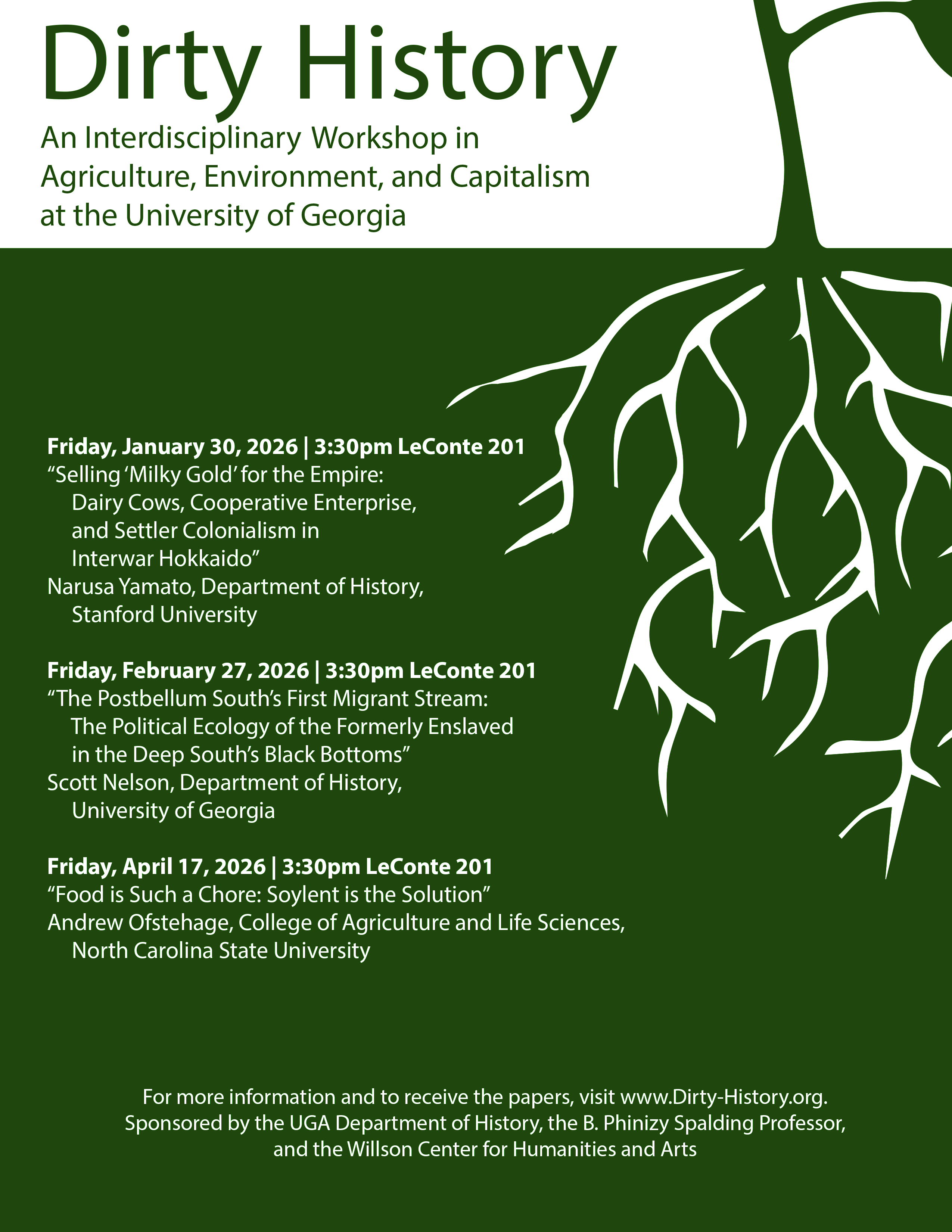 Friday, February 27 2026, 3:30 - 5:30pm 201 Conference Room, LeConte Hall Featuring Scott Nelson, University of Georgia. "The Postbellum South's First Migrant Stream: The Political Ecology of the Formerly Enslaved in the Deep South's Black Bottoms". Dirty History is an interdisciplinary workshop for scholars working at the intersection of agriculture, environment, and capitalism. Dirty History workshops are attended mainly by faculty and graduate students from UGA and area universities. The authors whose work we discuss come from all over. Participants should come having read the papers in advance. To receive the papers, zoom links, or be added to the listserv please email srnelson@uga.edu. Sponsored by the University of Georgia Department of History, the B. Phinizy Spalding Professor, and the Willson Center for Humanities and Arts. Dirty History graduate student and faculty workshop calendar in green with white text (495.7 KB)